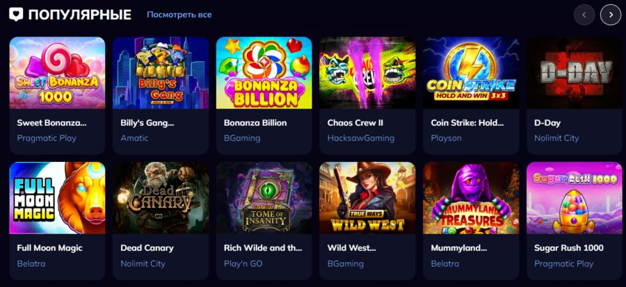 | Производители | Novomatic, Spinomenal, Belatra, Amatic, Igrosoft, Playtech, NetEnt, Microgaming, Red Tiger, Endorphina, NetGame, Evoplay, Betsoft, Ezugi, Push Gaming, Onlyplay, Mascot и другие |